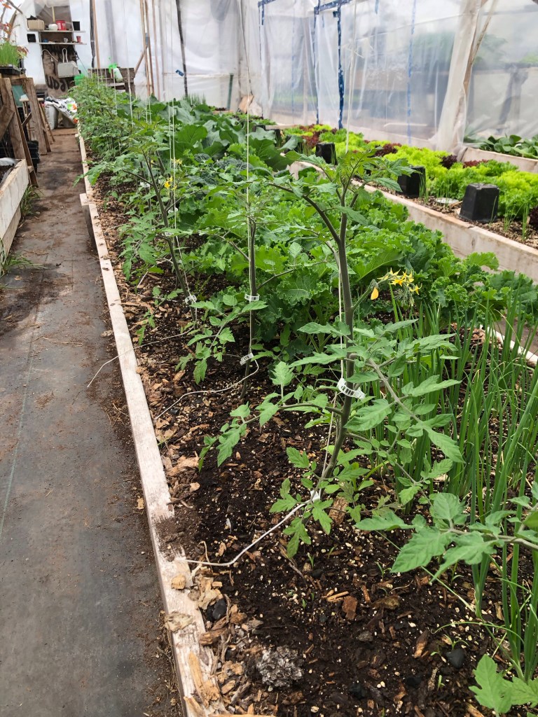 The single row of tomatoes growing in the left hand bed are being grown to 2 stems each and will cross over to fill the space once the brassicas are cropped out