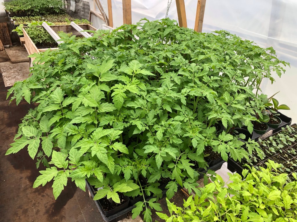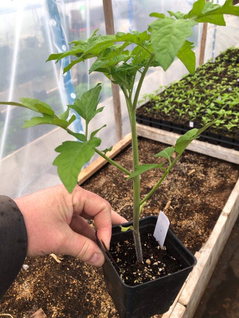I grow a variety of tomatoes each year. “Sakura” is the variety I grow of cherry tomatoes. Extra early I plant in the heated greenhouse. The first planting was transplanted mid March. The second round of tomatoes get planted in a minimal heated 50 ft hoophouses is Sakura for cherrys and Frederick as a beefsteak. Both of these varieties are inter-determinate and will produce continuously until frost kills them.
